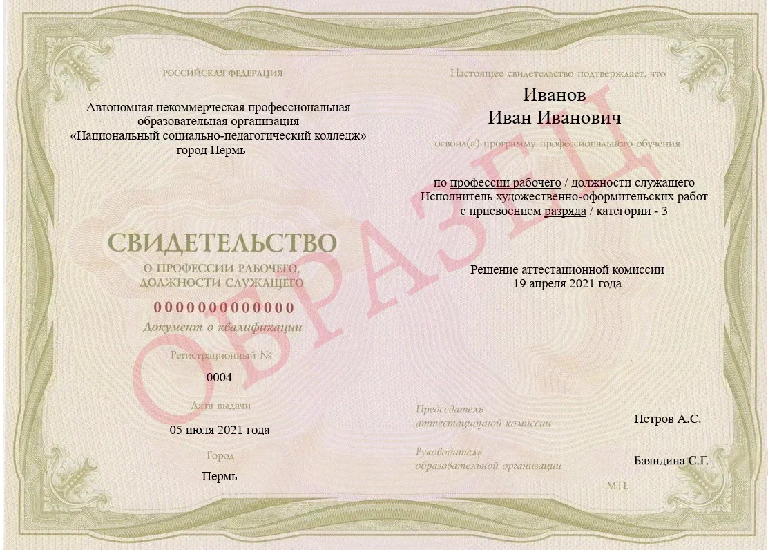 Диплом государственного образца о среднем профессиональном образовании | Свидетельство о профессии рабочего, должности служащего «Исполнитель художественно-оформительских работ» | Диплом о дополнительном профессиональном образовании |